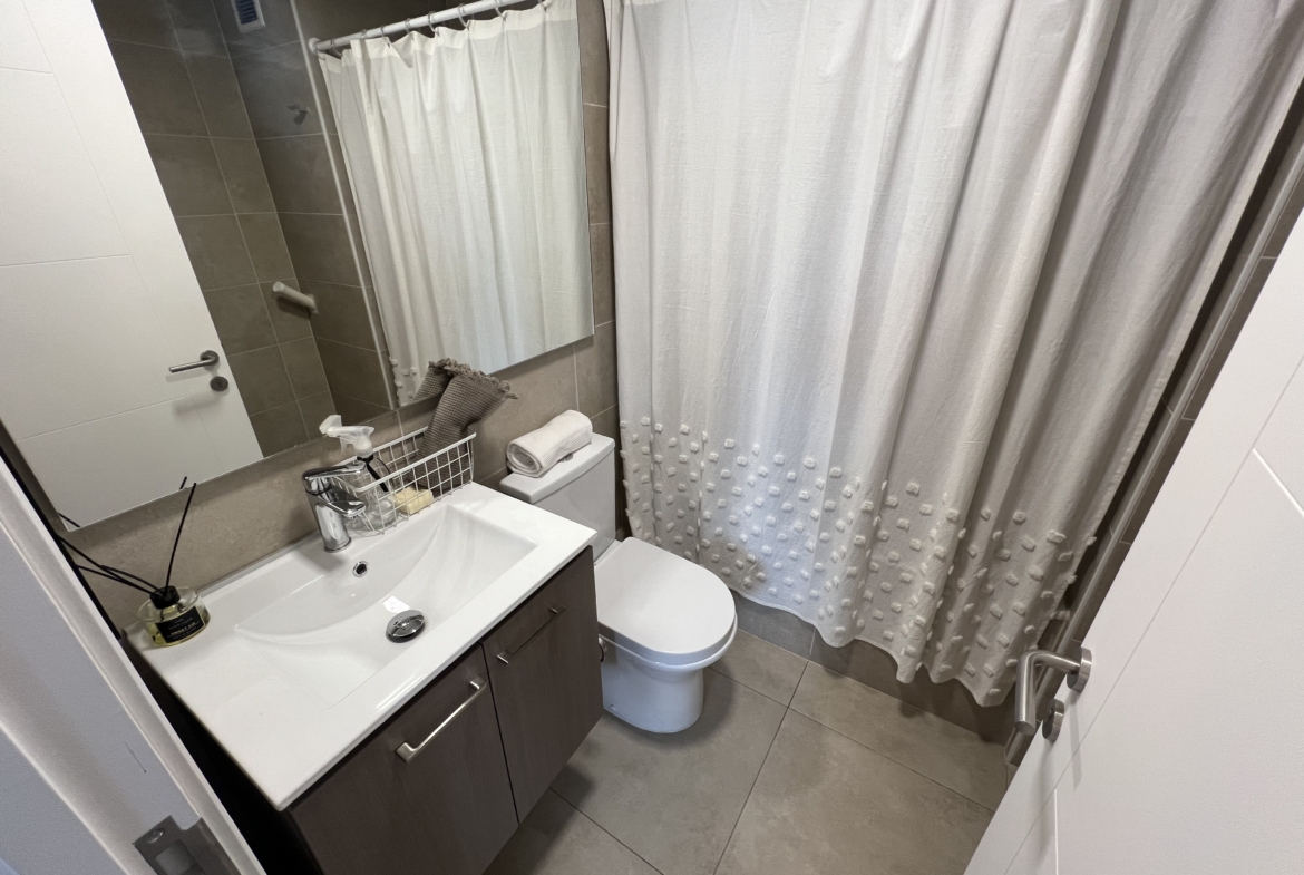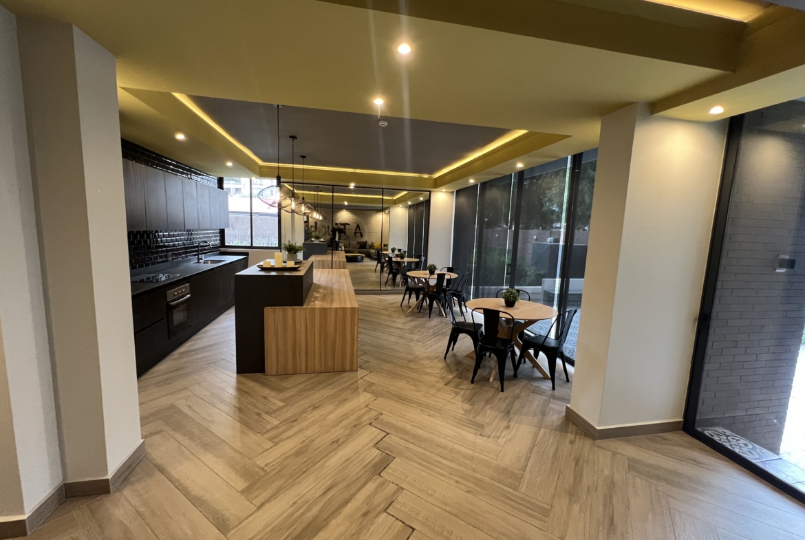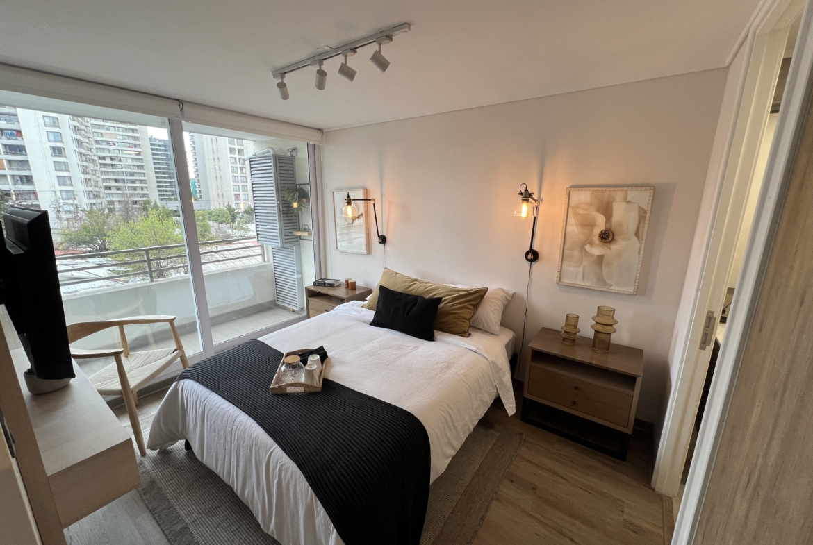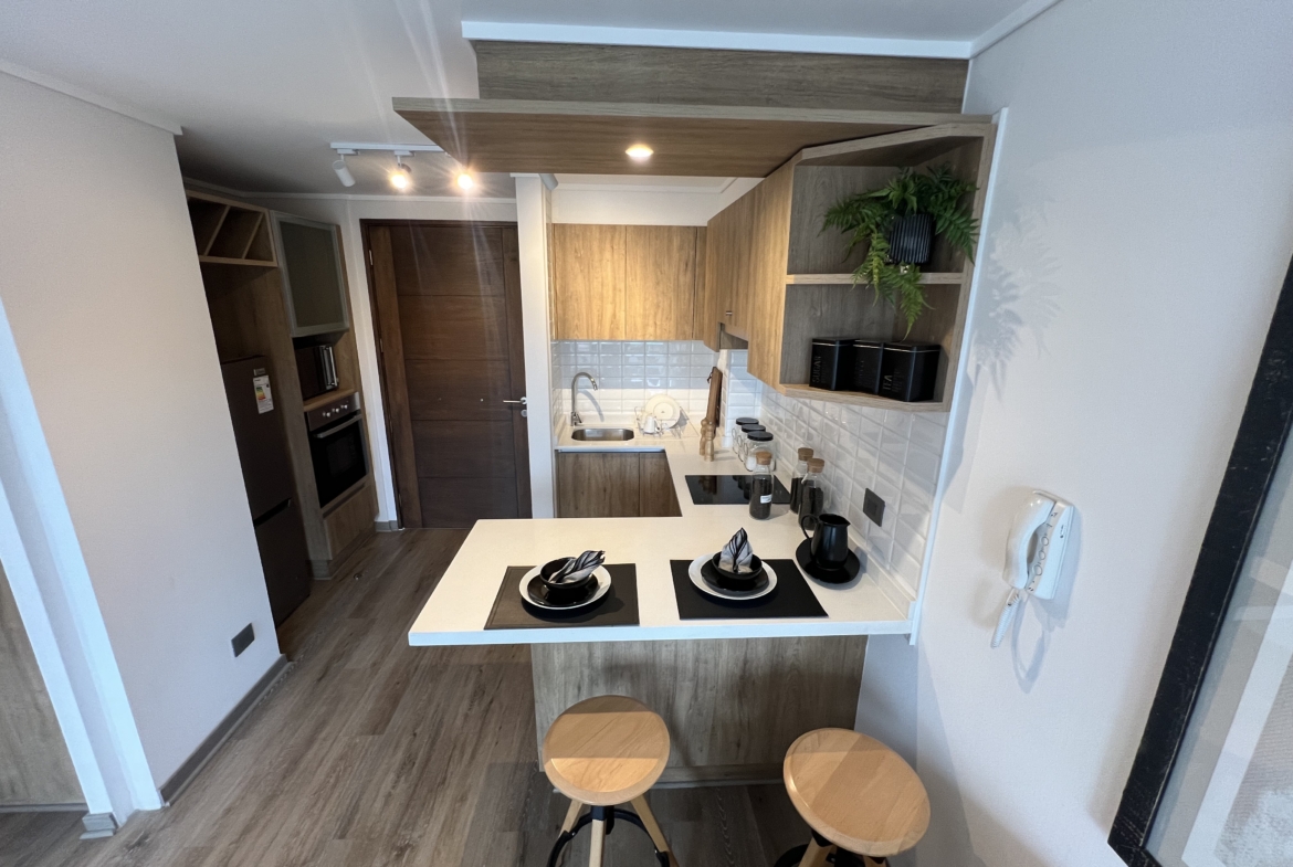 Cocina americana amoblada y equipada con espacio para microondas, campana, horno y encimera eléctricos | Amplio living con acceso a terraza | Dormitorio principal con amplio closet y baño en suite | Terraza